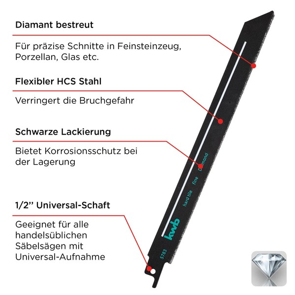 - Fine cut: The kwb reciprocating saw blades have a fine diamond granules, which effortlessly perform straight, clean cuts, for example in porcelain, glass or travertine.