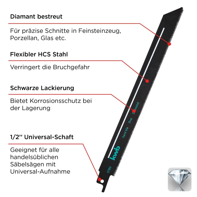 - Diamond-tested: thanks to the high-strength diamonds, it is possible to perform fine cuts on fragile materials, such as porcelain stoneware or porcelain with the kwb reciprocating saw blades.