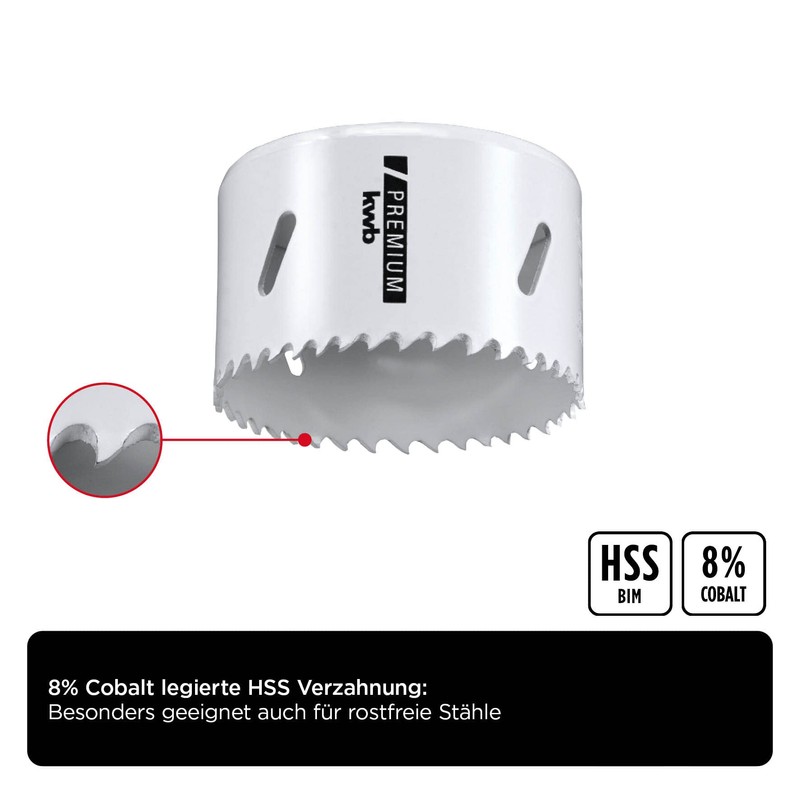 - 8% cobalt alloy: The HSS teeth of the hole saw for metals is 8% cobalt alloy and therefore particularly suitable for stainless steels, as it has a high hardness and wear resistance.