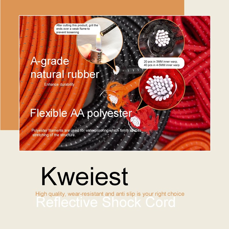- High quality materials: The surface is made of thick and soft AA grade polyester yarn (the same material as zipper fabric, which can extend the elastic life)+reflective material, and the interior is made of the same size A-grade white natural rubber yarn (carbon compound, durable, excellent elasticity, recommended for outdoor use) [specifications]. The width is about 5mm-17g/m, 6mm-21g/m, and there are various lengths and colors to choose from. The length is 5 meters, 10 meters, and 15 meters in packs, with an elongation rate of over 1 times. Strong elasticity! Superb elasticity and excellent durability, even after repeated use, it is not easy to break