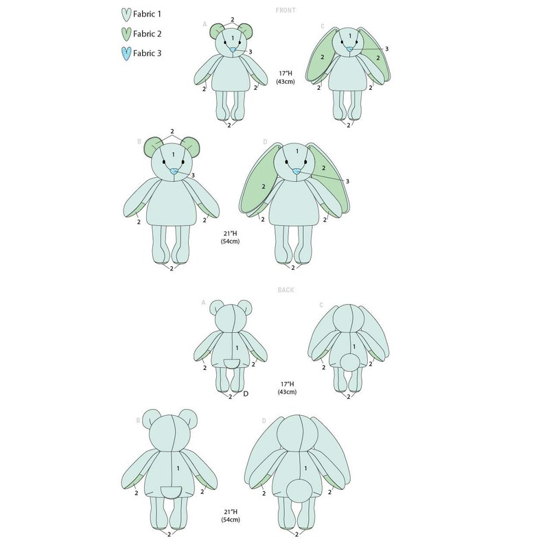 • Includes sewing templates, instructions, fabric recommendations, pattern pieces, and sizing guides for (4) different stuffed animals.