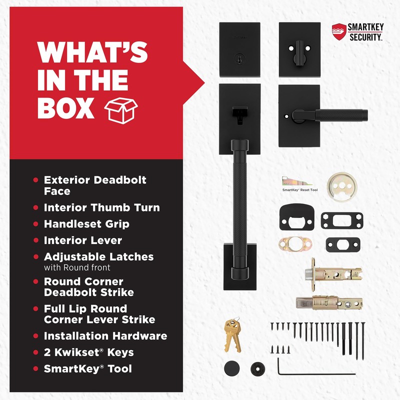 - BOX INCLUDES: Exterior Keyed Deadbolt, Handleset, Interior Turn Piece, Interior Lever, Adjustable Latch, 2 Keys, Screws, Strike Plate, SmartKey Tool, Installation Hardware, Install Guide