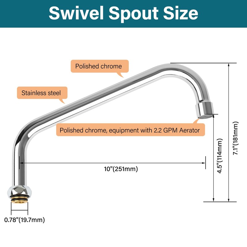 - 10" Swivel Spout Nozzle: 10" spout reach, 6.1" spout height with Max 2.2 gpm aerator water flow, good design for TS wall mount or deck mount faucet even commercial pre-rinse faucet working on one prep & utility compartment sinks.