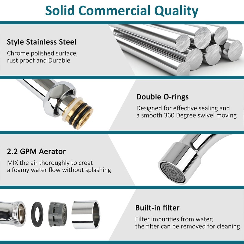 - 360°Short Add-on Spout: SUS304 stainless steel and solid brass constructed, polished chrome surface with high hardness and heat resistance characteristics. You can rotated the spout 360 degree by hand, easy to control and use.