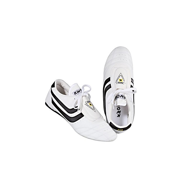 - The classic Kwon indoor training shoe for beginners has a thin, elastic rubber sole as well as a raised heel and ventilation holes.