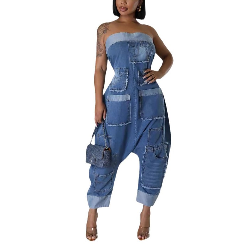 - Design: denim fabric, patchwork, strapless, bustier, tube, off-the-shoulder, wide leg jeans, plus size, multiple pockets. Our sexy denim wide leg jumpsuit is unique. The off-the-shoulder style stays cool and the patchwork denim creates a chic look.