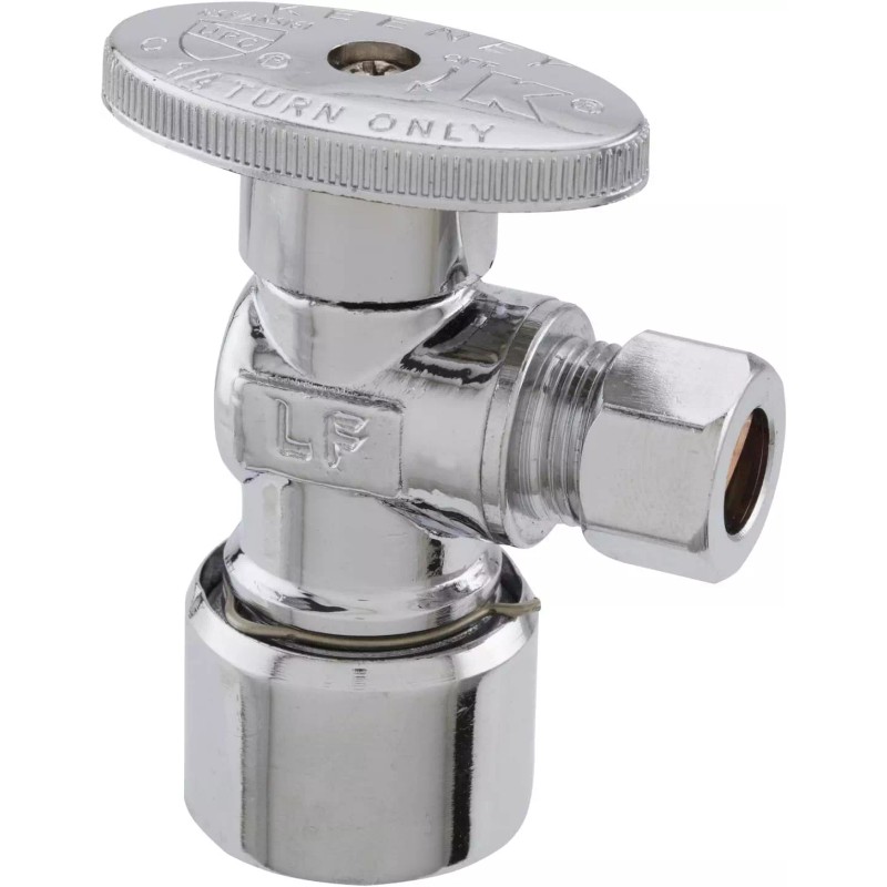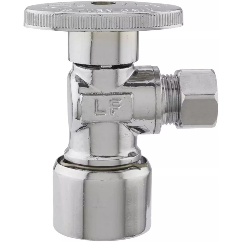Solid brass chrome plated quick lock quarter turn angle valve push fit application. Connects to copper/CPVC/PEX. Tubing insert included. Inlet: 5/8in OD, Outlet: 3/8in OD Lead Free: Contains less than 0.25% weighted average lead content on wetted surfaces