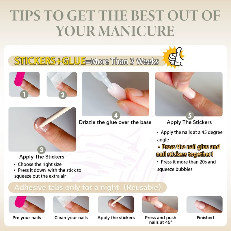 - 【❤Tips for Using】If you want the nails glue on long-lasting, please use nail glue instead of nail adhesive tabs. Please feel free to contact with us if you had any question, refund with 24 hours had any quality problem.Your satisfaction is our promise!