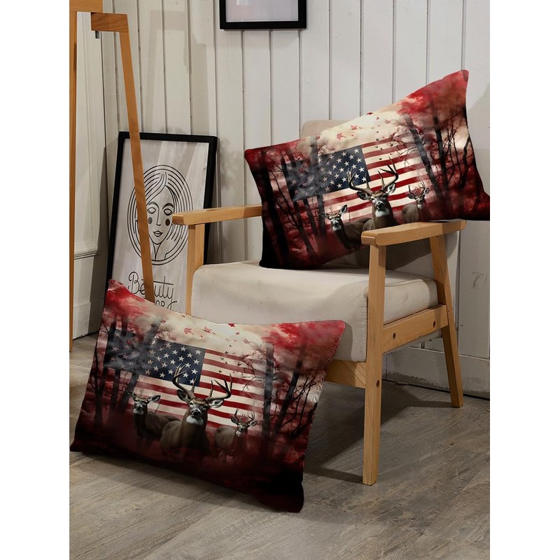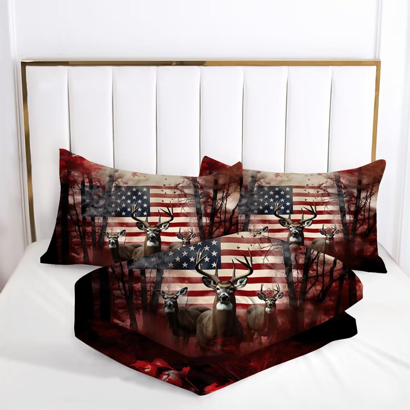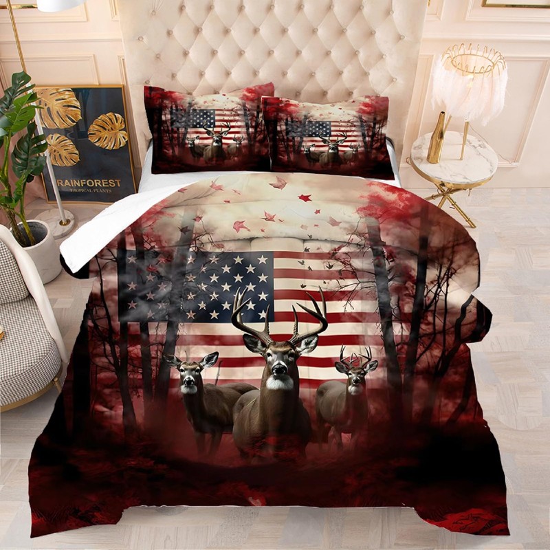 kxry Red and White Elk USA American Flag Comforter Set Queen Size Quilt for Boys Kids Teens US Stars Stripes Flags Bedding 1 Comforter + 2 Pillow Cases