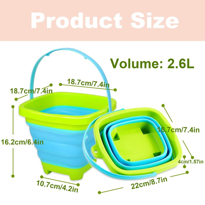 - 【MULTIFUNCTIONAL BUCKET AND SPADE】Beach toys can be used indoors or outdoors, which is very suitable for beach parties, summer parties, travel, camping, fishing, picnics, home washing, outdoor cool drinks, fruit picking, snow, water splashing, party gifts, etc. The maximum capacity of each bucket is 2.6L. It is a must-have for summer beaches!