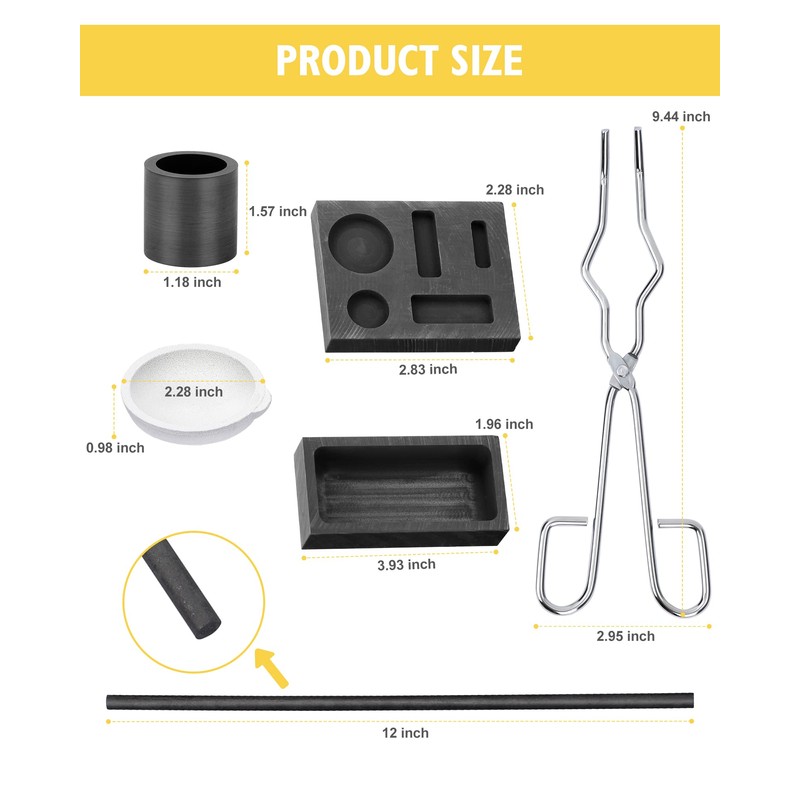 - Size Specifications: The crucible mold has an approximate diameter of 3.93 x 1.96 inches,each crucible stir rod measures around 12 inches (30 cm) in length,the 5-in-1 graphite ingot mold boasts dimensions of about 2.83 x 2.28 inches in diameter,the quartz crucible is roughly 2.28 inches in diameter and 0.98 inches in height,the tong extends to about 9.44 inches in length,and the cylindrical graphite stands at a diameter of approximately 1.18 inches with a height of around 1.57 inches.