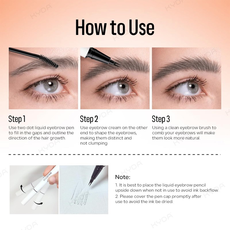 KYDA 2 Pcs Two-Fork Tip Microblading Liquid Eyebrow Pen, Dual-Ended Eyebrow Tool with Tinted Brow Cream, Lasting Waterproof Formula for Defined and Tinted Natural Hair-Like Brow, Quick Dry, Brown
