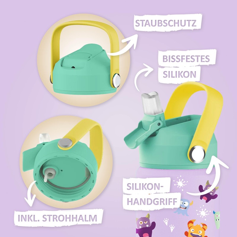- Child-friendly and safe: the bite-resistant silicone mouthpiece ensures a natural drinking experience, while the powder-coated drinking bottle ensures a firm hold. Thanks to the silicone ring, the bottle does not slip and protects surfaces from dents. Makes drinking fun.