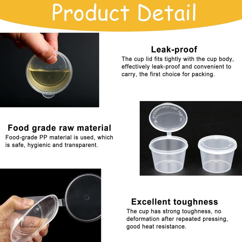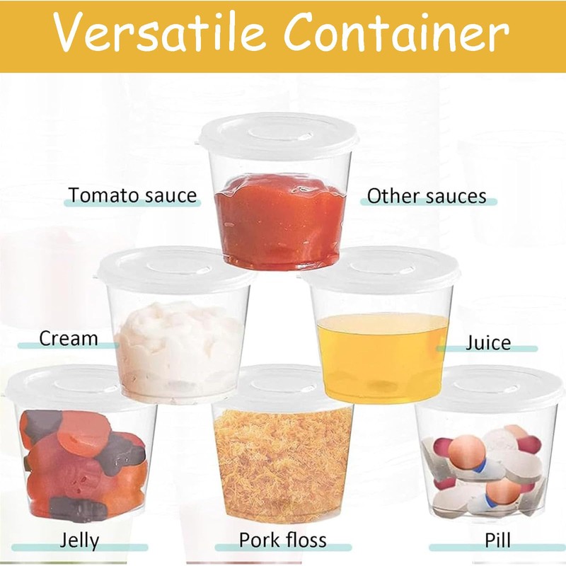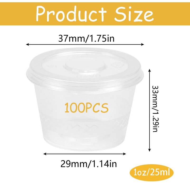 - 【Clear Plastic Condiment Cups】You will get 100pcs 1 oz clear small plastic pots, The Clear Construction Is A Professional Option For Your Establishment. Showcase Your Signature Sauce, Coleslaw, Or House Dressing. This Cup With A Clear Lid Is Made To Easily Identify What's Inside While Still Keeping Contents Secure!
