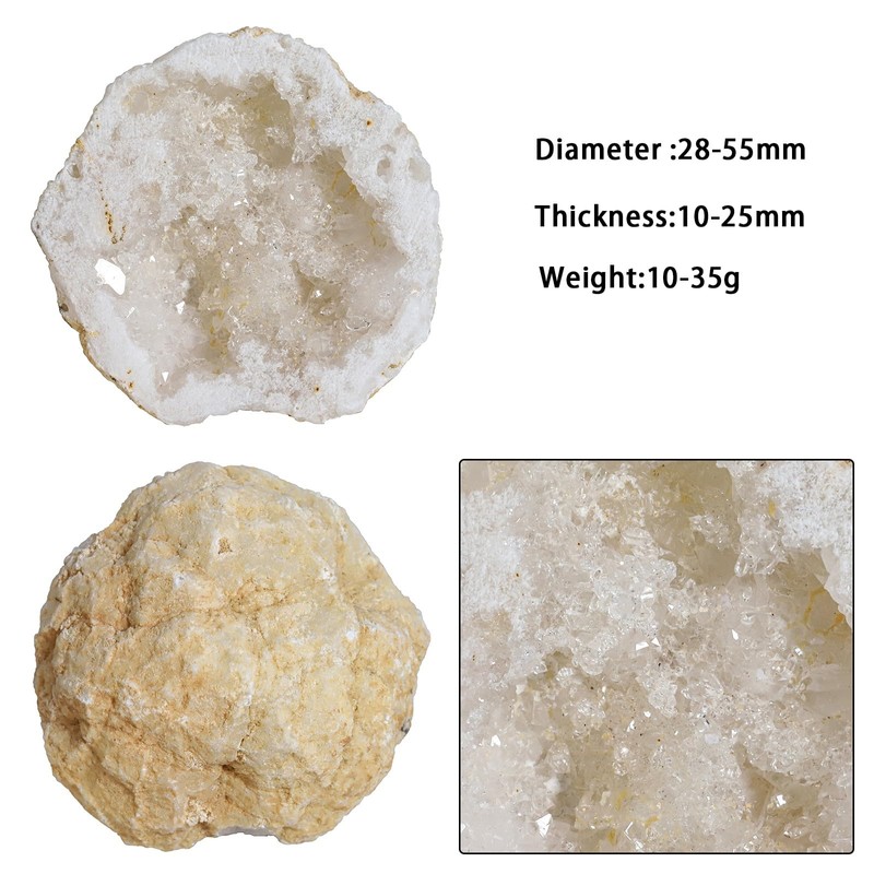 - Irregular titanium coated crystal geode size: stone diameter: 28 mm - 55 mm, thickness: 10 mm - 25 mm; weight approx. 10g-35g Due to the uniqueness of natural gemstones, this colorful stone cluster specimen varies in size, shape, color, and cluster.