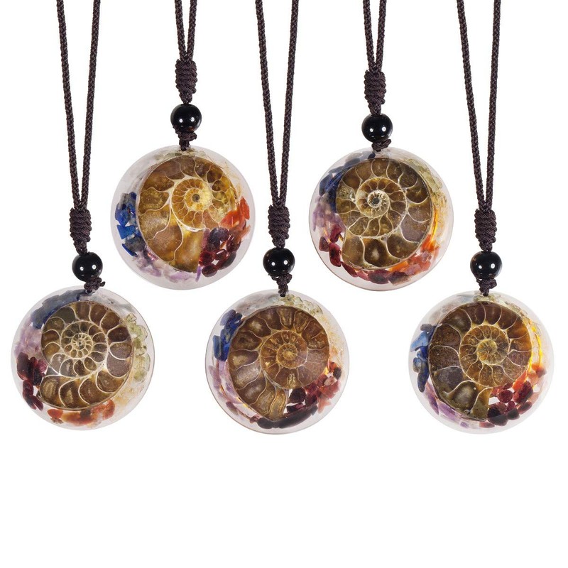 KYEYGWO Natural Snail Ammonite Fossil Pendant for Men and Women, 7 Chakras Stone Necklace, Reiki Healing Crystal Pendant, Gemstone Amulet, Retro Jewellery with Adjustable Nylon Rope, Resin Nylon