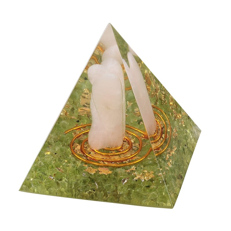 - Material: the healing stone pyramid surface is made of resin, inside there is base of peridot tumbled stones, copper shavings, Reiki symbol copper wire and a rose quartz angel figures. Crystal pyramid looks very beautiful and colourful, rich sense of hierarchy and fashion.