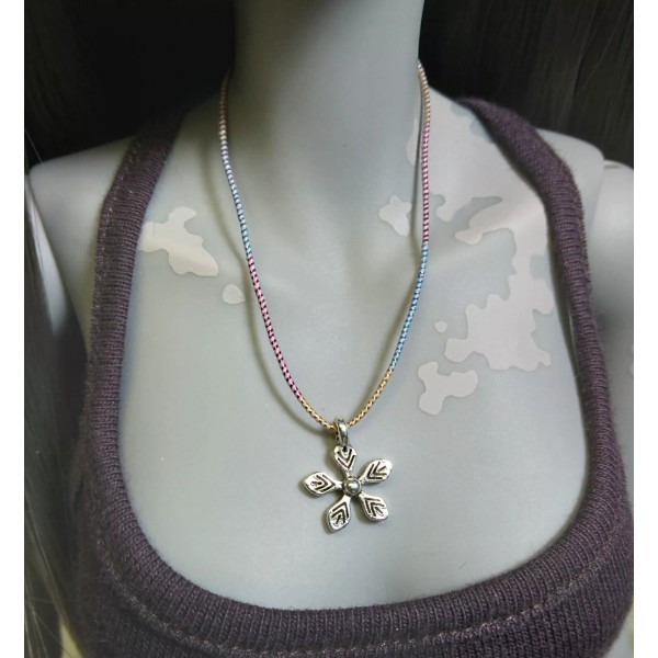 The metallic flower pendant is a store bought charm, the necklace cord is stretchy elastic with a multi colored sparkle.