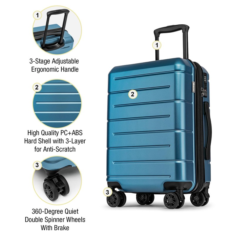 - 360°Spinner Wheels with Brake for Effortless Travel: Glide through airports easily with our smooth rolling, hardside carry-on luggage. With four oversized, double spinner wheels and a 6.61 lbs lightweight hard case, the suitcase moves effortlessly in all directions