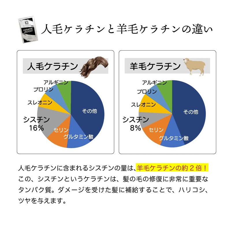 - Why Human Hair Keratin is a good idea: Keratin is formulated with a general treatment that is a lot of wool keratin (keratin of sheep wool). KYOGOKU focuses on human hair keratin because there is a significant difference in permeability and hair repair. When hair is damaged, the protein will be destroyed and cavity (damaged holes). By inserting keratin into the damaged hole, the interior is repaired to improve swelling, spreading, and breakage and leads to glossy hair