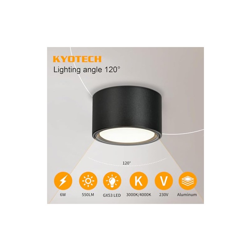 KYOTECH KYOTECH LED Aufbauspot - 3000K Deckenspots Schwarz Matt 6W 550LM GX53 LED Aufbaustrahler - ?95x55mm Aufputz 230V Aufbauleuchte Deckenlampe Spots Deckenleuchte fr Schlafzimmer Wohnzimmer