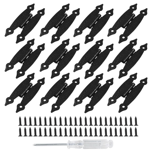 Material: Metal Color: Black Overall Size (L*W): 90 x 38 mm/ 3.54" x 1.5" Hole Spacing: 62 x 23 mm/ 2.4" x 0.9" Package Includes: 12 Pack x H-Shape Cabinet Hinges, 48 Pcs x Mounting Screws, 1 Pcs x Small Screwdriver