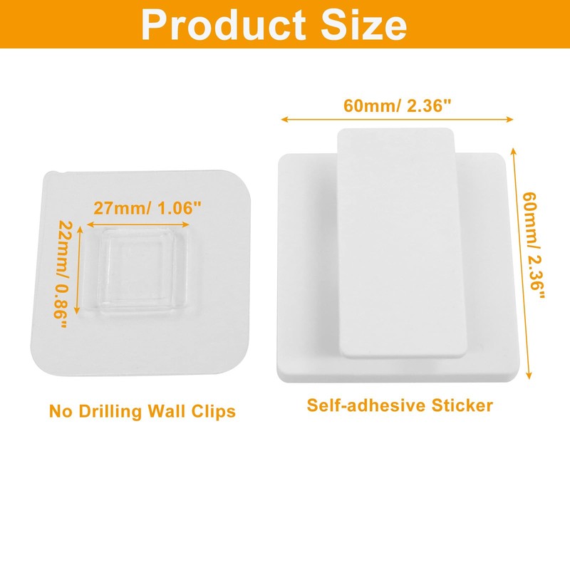 - Package Content: 4 pcs x Self Adhesive Hanging Clips. Size(L*W): 60mm/ 2.36" x 60mm/ 2.36"; With a minimalist white design, these clips blend seamlessly into your decor while providing functionality.