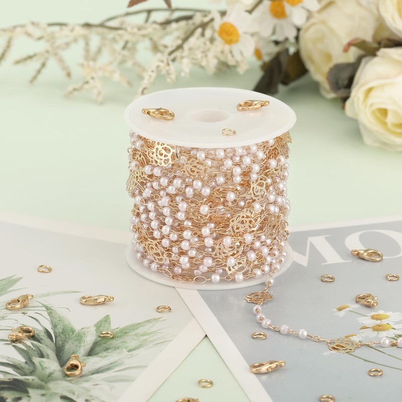 KYUNHOO 16.4 Feet 3MM Faux Pearl Bead Chain with Spool Brass Cable Chain Bulk Rose Flower Link Chains with Jewelry Clasps for Handcraft Making Finding Supplies
