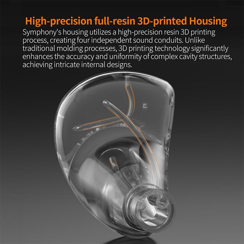 • 【High-precision 3D Printed Housing】 KZ Symphony IEM earphone's housing utilizes a high-precision resin 3D printing process, creating four independent sound conduits. Unlike traditional molding processes, 3D printing technology significantly enhances the accuracy and uniformity of complex cavity structures, achieving intricate internal designs.