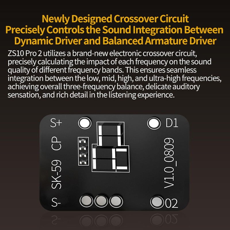 - HIFI Sound kz wired earbuds zs10 pro 2 utilizes a brand-new electronic crossover circuit ,precisely calculating the impact of each frequency on the sound quality of different frequency bands. this ensures seamless integration between the low,mid,high,and ultra high frequencyies,achieving overall three-frquency balance,delicate auditory sensation ,and rich detail in the listening experience