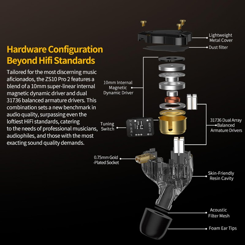 - "hardware configuration beyond hifi standards iem earbuds Tailored for the most discerning music aficionados, the kz zs10 pro 2 wired headphones features a blend of a 10mm super-linernal magnetic dynamic driver and dual 31736 balanced armature drivers. This combination sets a new benchmark in audio quality,surpassing even the loftiest hifi standards,catering to the needs of professional musicians,audiophiles,and those with the most exacting sound quality demands."