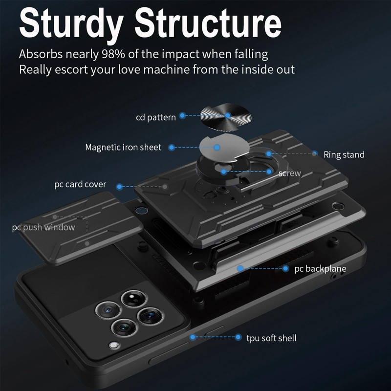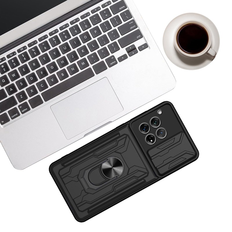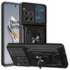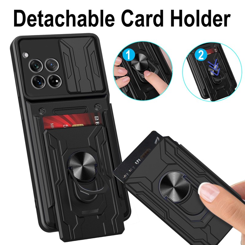 KZIOACSH for Oneplus 12 5G Case, [Slide Camera Cover] [Magnetic Kickstand Ring] [Removable Card Holder] Dual Layer Hard PC + Soft TPU Cover Military Grade Anti-Scratch Protective Bumper Case,Black