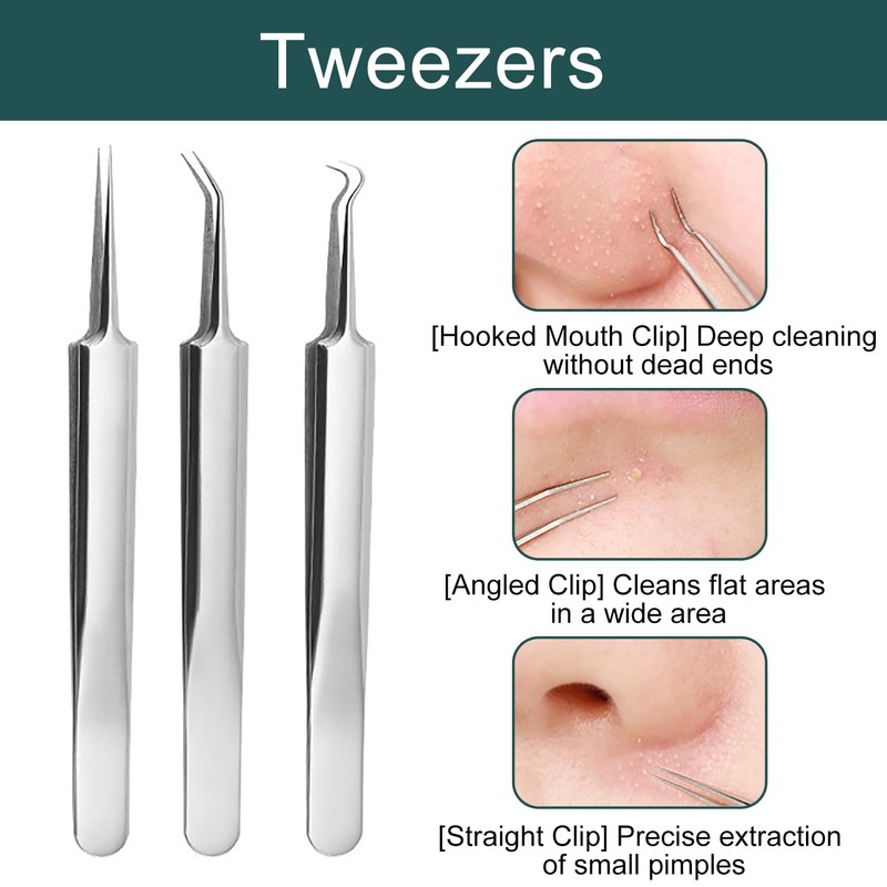 - Curved tweezers: The curved tweezers are ideal for removing stubborn blackheads, whitehead and also for combating blackheads of all sizes and depths.