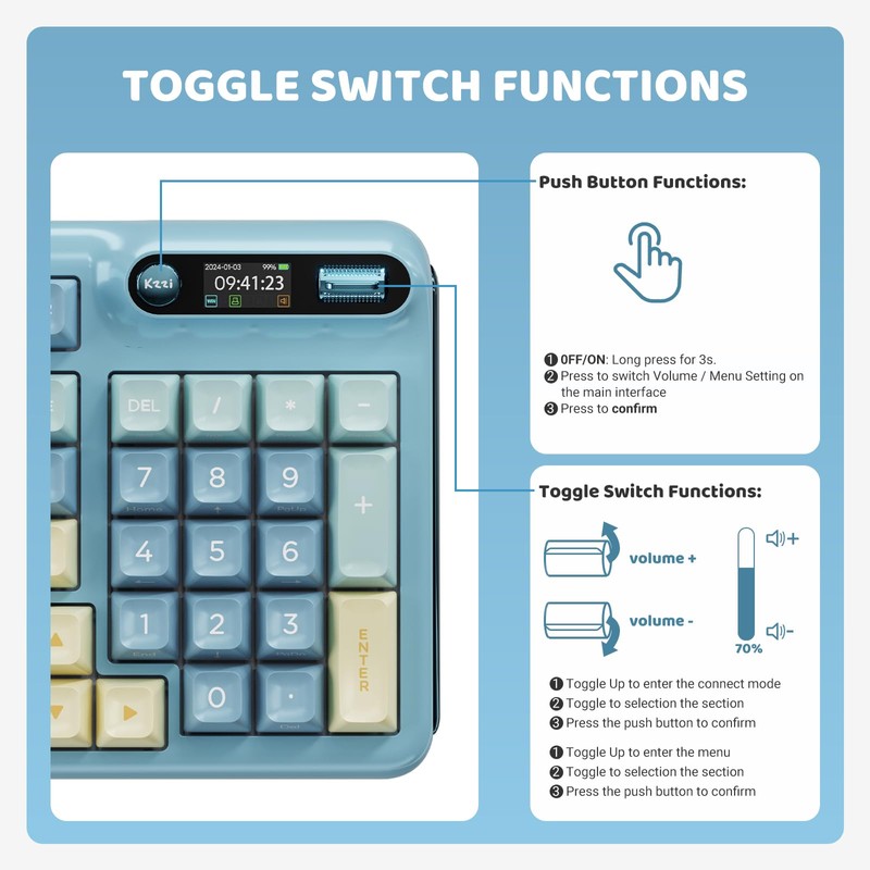 - Innovative Smart Display & Knob: Elevate your typing and gaming experience with the KZZI wireless mechanical keyboard. Featuring a cutting-edge display screen and a built-in three-way knob, you can easily view system info and adjust keyboard settings at a glance. Plus, express your style by displaying custom GIFs, like your favorite pet, directly on your keyboard.