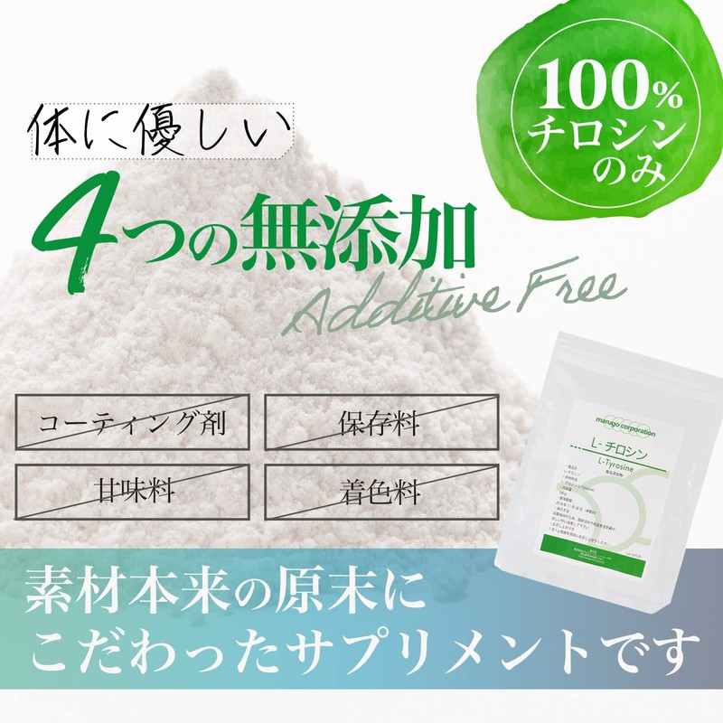 - 【商品詳細】内容量:100g 原材料:100%L-チロシンのみの粉末です。コーティング剤や保存料、着色料、甘味料等の添加物は、一切使用していません。※marugo(マルゴ)では、素材本来の原末にこだわっています。 使用上注意:品質保持のため、直射日光や高温多湿を避け涼しい場所に保管してください。※梱包には遮光性、防湿性に優れており、強度も高いアルミ袋を採用しております。