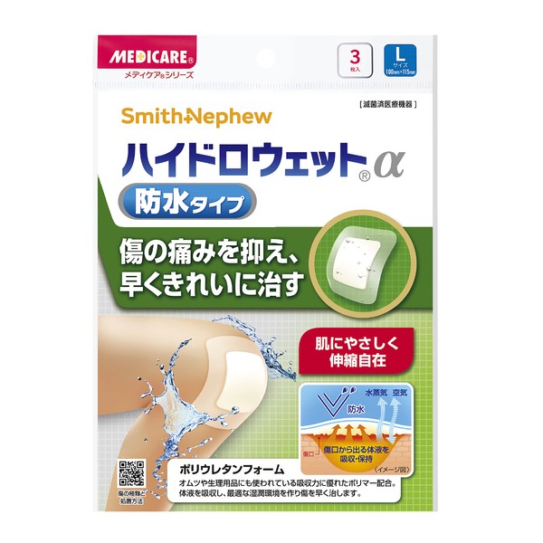 - 【ハイドロウェットα防水タイプ の特長】1.傷を早く治す…皮膚の回復に適した環境を整える体液(滲出液)を保つので傷を早く治します。 2.傷をきれいに治す…傷口の湿潤環境を保つことでかさぶたができにくくなり、傷をきれいに治します。 3.痛みをやわらげる…痛みの原因となる炎症や乾燥によって起こる神経への刺激を抑えるので、傷の痛みがやわらぎます。