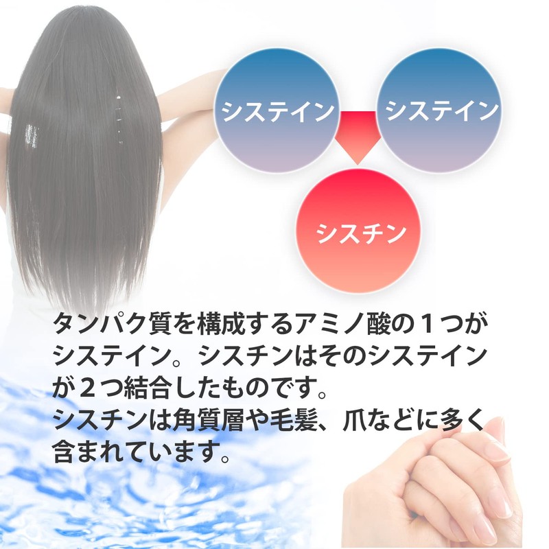 L-シスチンとは L-システインが2分子結合したアミノ酸で、髪や爪に含まれるケラチンという、たんぱく質を構成しています。髪を燃やすと嫌な臭いがするのは、L-シスチンには硫黄が含まれている含硫アミノ酸があるからです。
