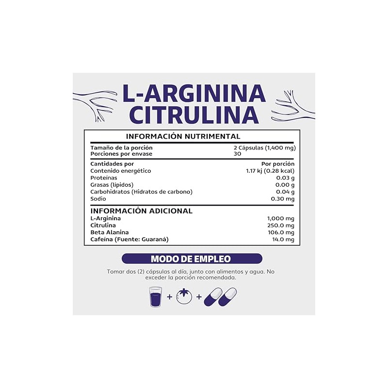 L-Arginina 1000mg  Citrulina  Beta Alanina  Cafena (de Guaran)  Aminocido Esencial  Citrulina como Precursor de xido Ntrico - 60 cpsulas