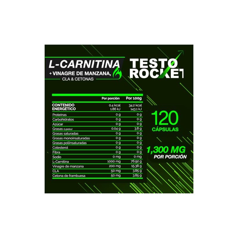 L Carnitina 4en1, 1300mg porcion: Carnitina, Vinagre de Manzana, CLAs y Cetonas de Frambuesa | Testo Rocket Carnitina 120 Cápsulas