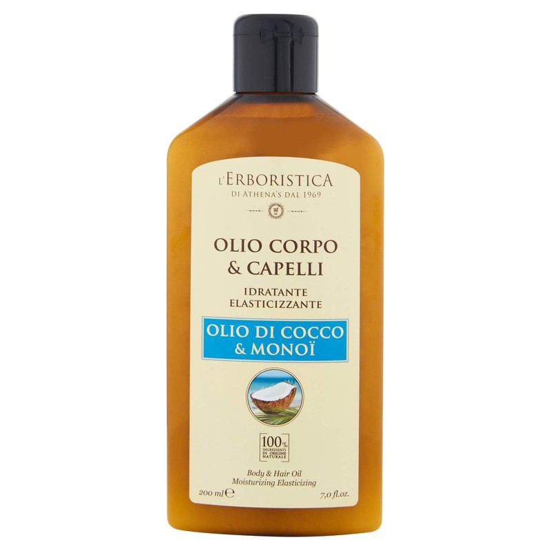L'ERBORISTICA DI ATHENA'S DAL 1969 - Coconut and Monoi Oil for Body and Hair, Moisturising for the Skin Based on Natural Products with Coconut Scent, Dermatological Oil - 200 ml