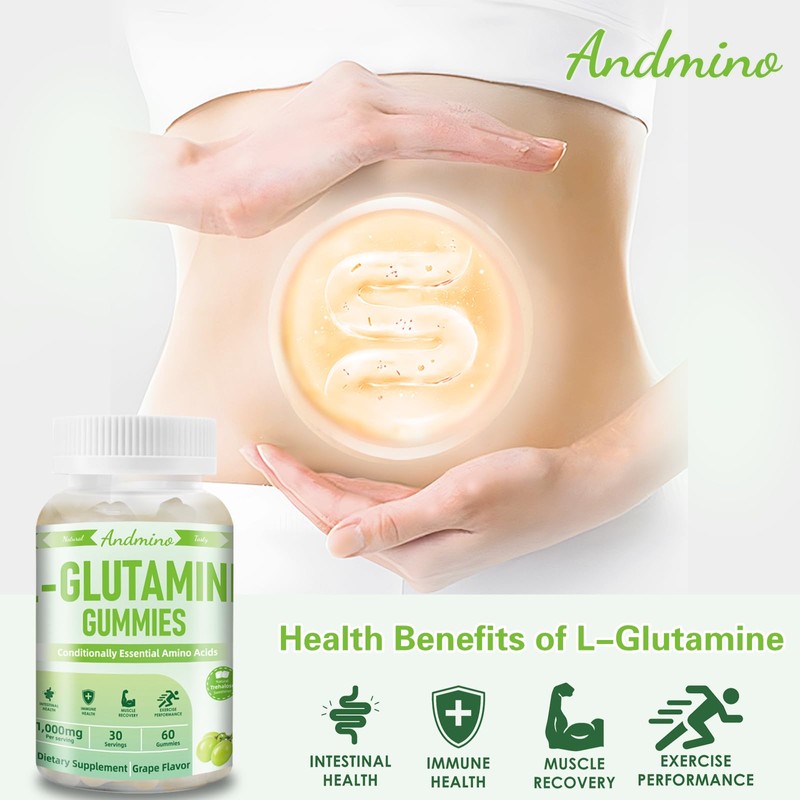 - L-Glutamine Gummies Supplement: Our Andmino Glutamine gummies contain 1,000 mg L-Glutamine per serving, sourced from beetroot. Glutamine is one of the 20 amino acids, that our body uses to make protein