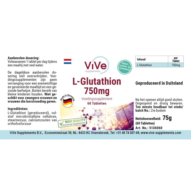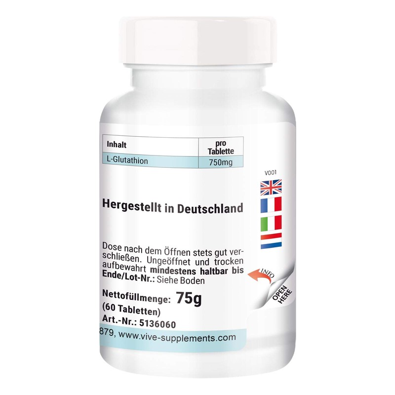 L-Glutathione Tablets, 750 mg, 60 Tablets, High Dose, Vegan, Quality from Germany ViVe Supplements