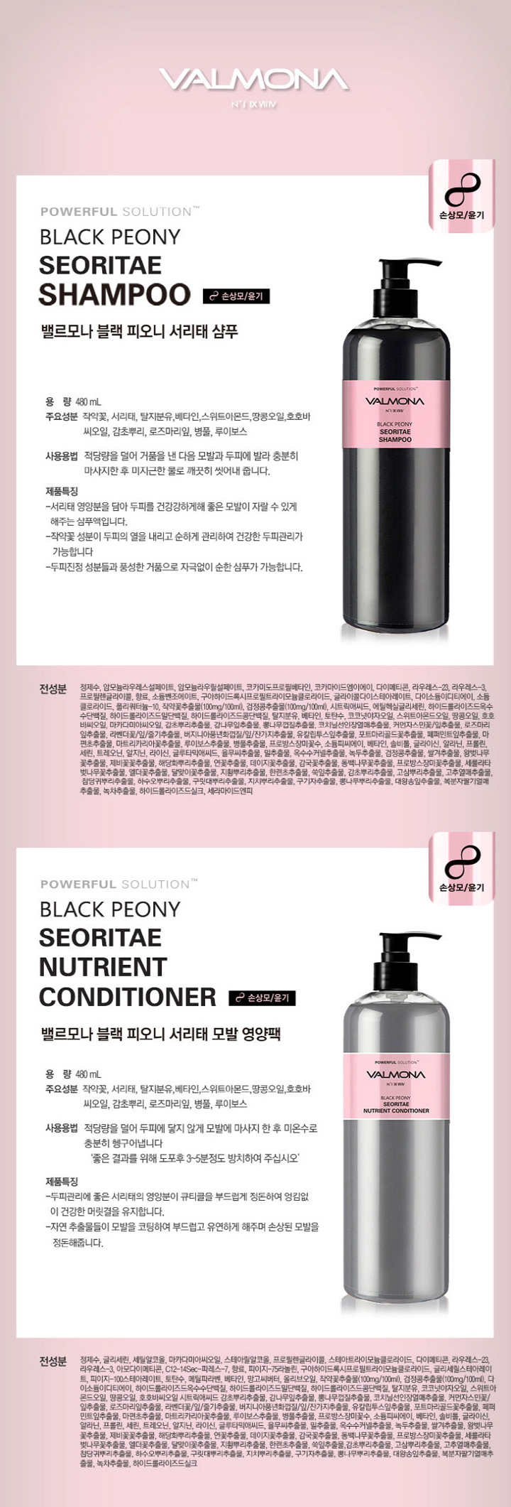 사용방법 샴푸: 적당량을 덜어 두피와 모발에 마사지하듯 문지른 후, 물로 충분히 헹구어냅니다컨디셔너: 샴푸 후 적당량을 덜어 모발에 도포한 후 5-10분 간 방치 후 물로 충분히 헹구어 냅니다.