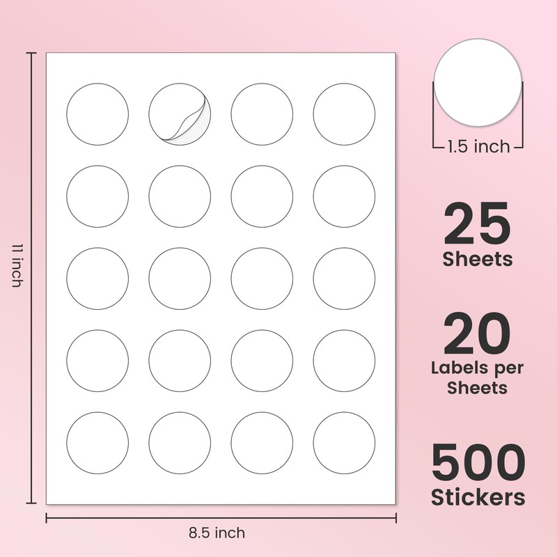 - Specification: Each label size 1.5" Diameter, sheet size 8.5" x 11". Includes 25 sheets with 20 labels per sheet, totaling 500 blank circular labels. Print templates available for download