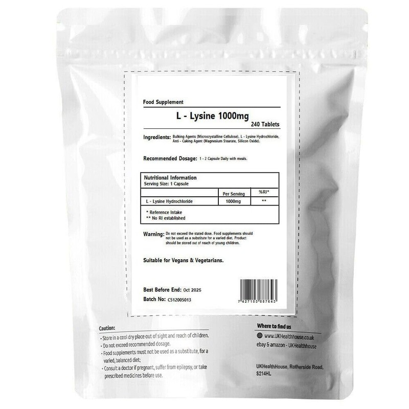 Ingredients: Bulking Agents (Microcrystalline Cellulose), L-Lysine Hydrochloride, Anti-Caking Agent (Magnesium Stearate, Silicon Oxide).