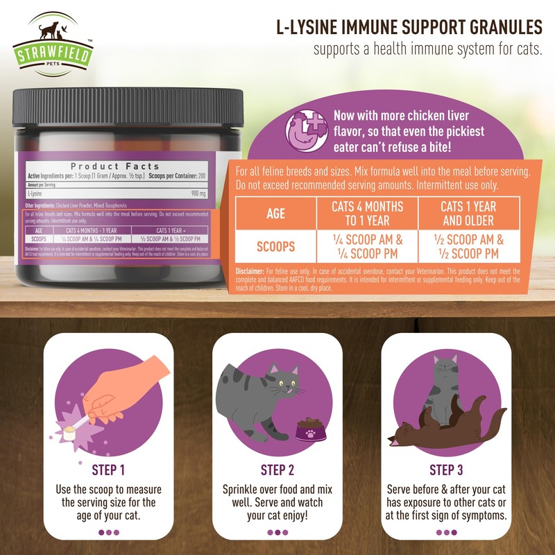 - L-LYSINE FOR CATS SUPPLEMENT POWDER - 900 mg of l-lysine hydrochloride per scoop, natural chicken liver flavor for picky eaters. Safe for kittens, adults & senior cats of all breeds. Sprinkle l-lysine immune system support supplements over cat food once per day.