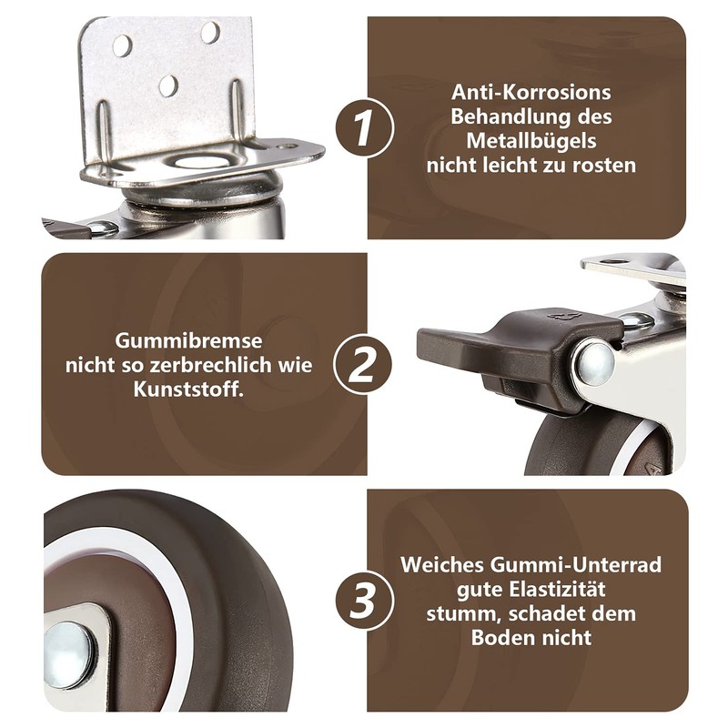 L-Mounting Plate Furniture Castors Rubber 25 mm with 2 Brakes, 360 Degree Heavy Duty Castors with 53 kg Load Capacity, Silent Solid Rubber Castors for Furniture Transport, Table, Cabinet, Set of 4