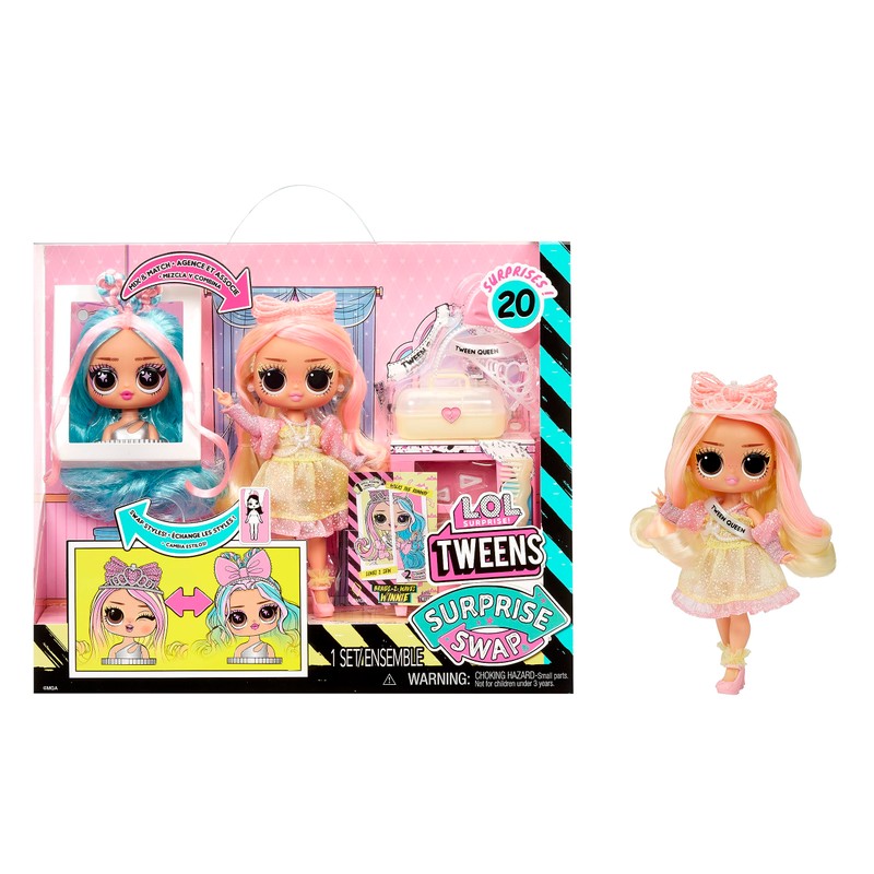 - DOLLS WITH 20+ SURPRISES: LOL Surprise Tweens Surprise Swap Fashion Dolls with 2 unique looks and a swapping head feature include a styling head, fabulous fashions, socks, shoes, a caboodle, a tiara, a sash, hairstyling accessories, a doll stand, and more