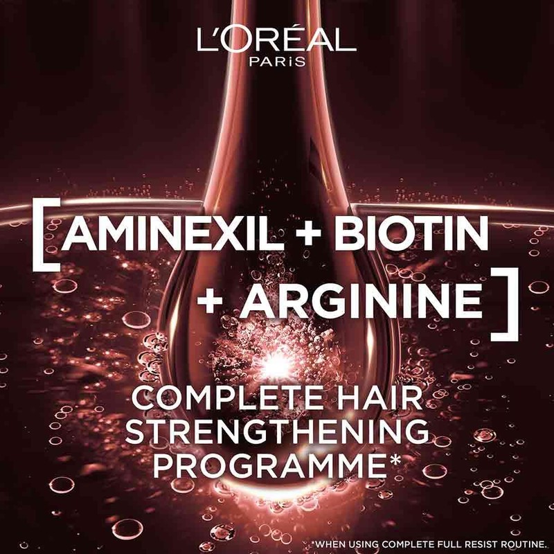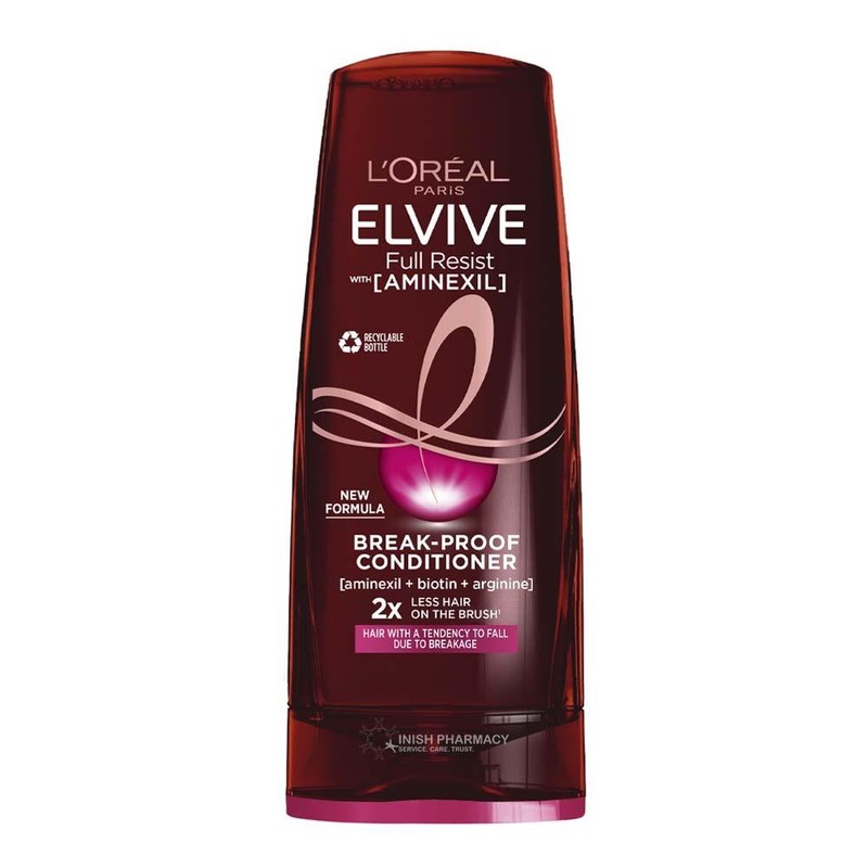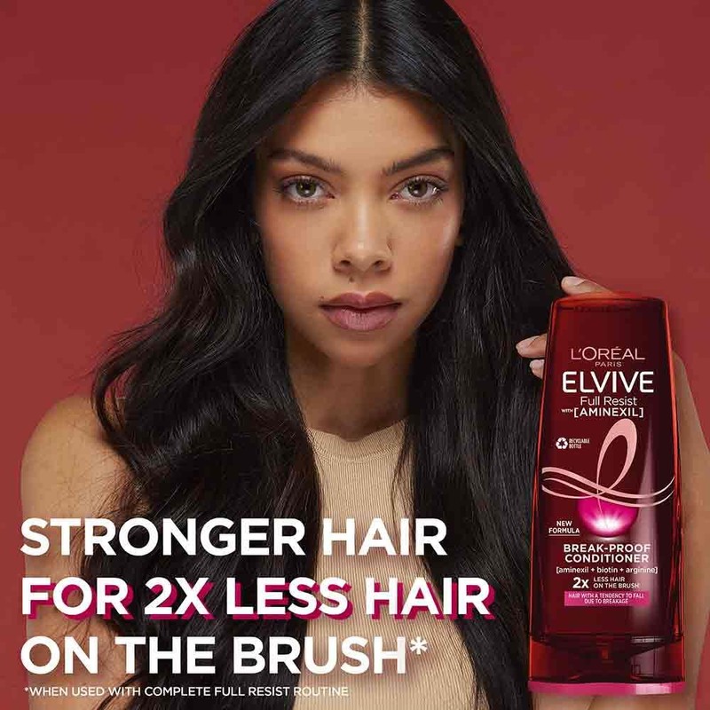 The L'Oreal Elvive Full Resist (Aminexil) is a strengthening Conditioner that offers up to 2 times less hair on your hairbrush. This Conditioner is ideal to use if your hair tends to fall out or break due to stress, brushing, seasonal change or heat styling. This formula includes Aminexil which is clinically proven to help strengthen your hair and reduce hair breakage. It also includes Biotin, Vitamin B5 and Arginine that act as a lightweight barrier to protect and strengthen the hair.