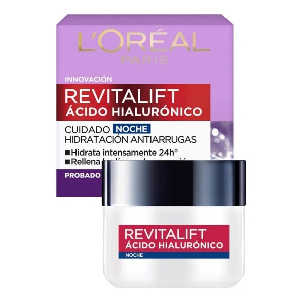 Descubre la L'Oréal Paris Crema de Noche Revitalift con Ácido Hialurónico, una solución nocturna avanzada diseñada para rejuvenecer y revitalizar tu piel mientras duermes. Esta crema hidratante anti-líneas de expresión está especialmente formulada para mujeres a partir de los 30 años y es adecuada para todo tipo de piel, ofreciendo una hidratación intensa y resultados visibles en la reducción de líneas de expresión.